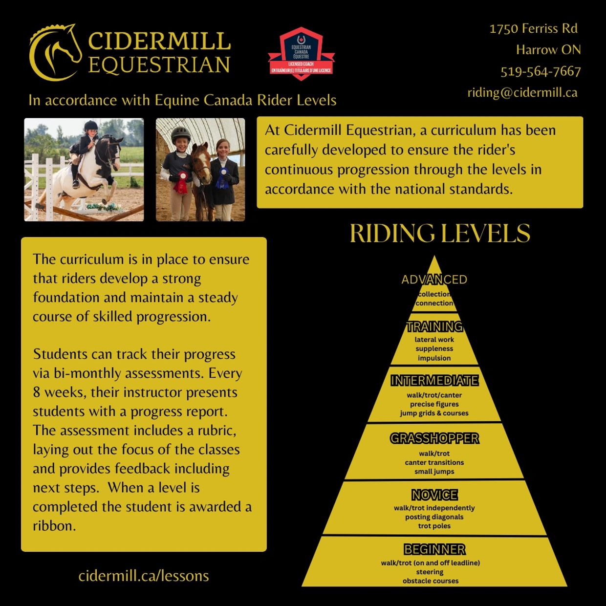 Riders are enrolled in a weekly lesson program on our well schooled horses. They may start in a private lesson and move to a group lesson when they are deemed ready by their instructor. Riders learn to groom and tack their horses appropriately for their lesson. In their lessons, they work with horses in flat work, work over ground poles and eventually over jumps. The focus of lessons is on proper position, correct use of aids, and safe handling and riding practises. Cidermill offers their students regular opportunities to for Rider Level Testing under EQUINE CANADA’S LEARN TO RIDE PROGRAM